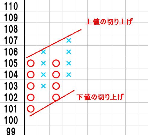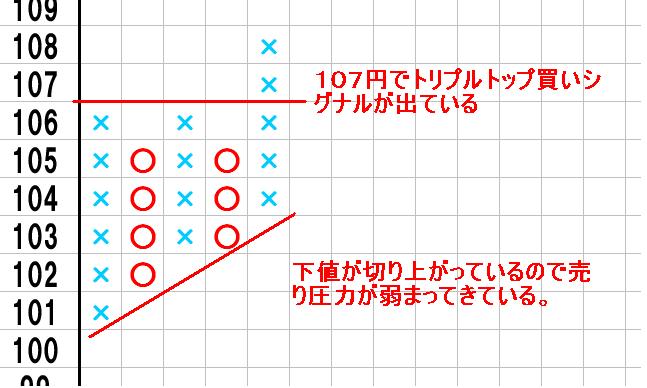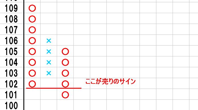 ちなみにこの場合買いサインは107円のライン、損切りは102円を下回って101円に○列記入された時点で損切りとなります。