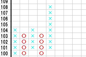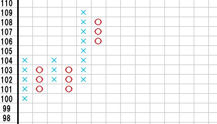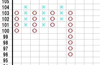 下の図のようにもみあって、最終的に×列が前回の×列を超えて上昇したあと、供給か需要を支配し○列で転換したところから目標値を計算します。